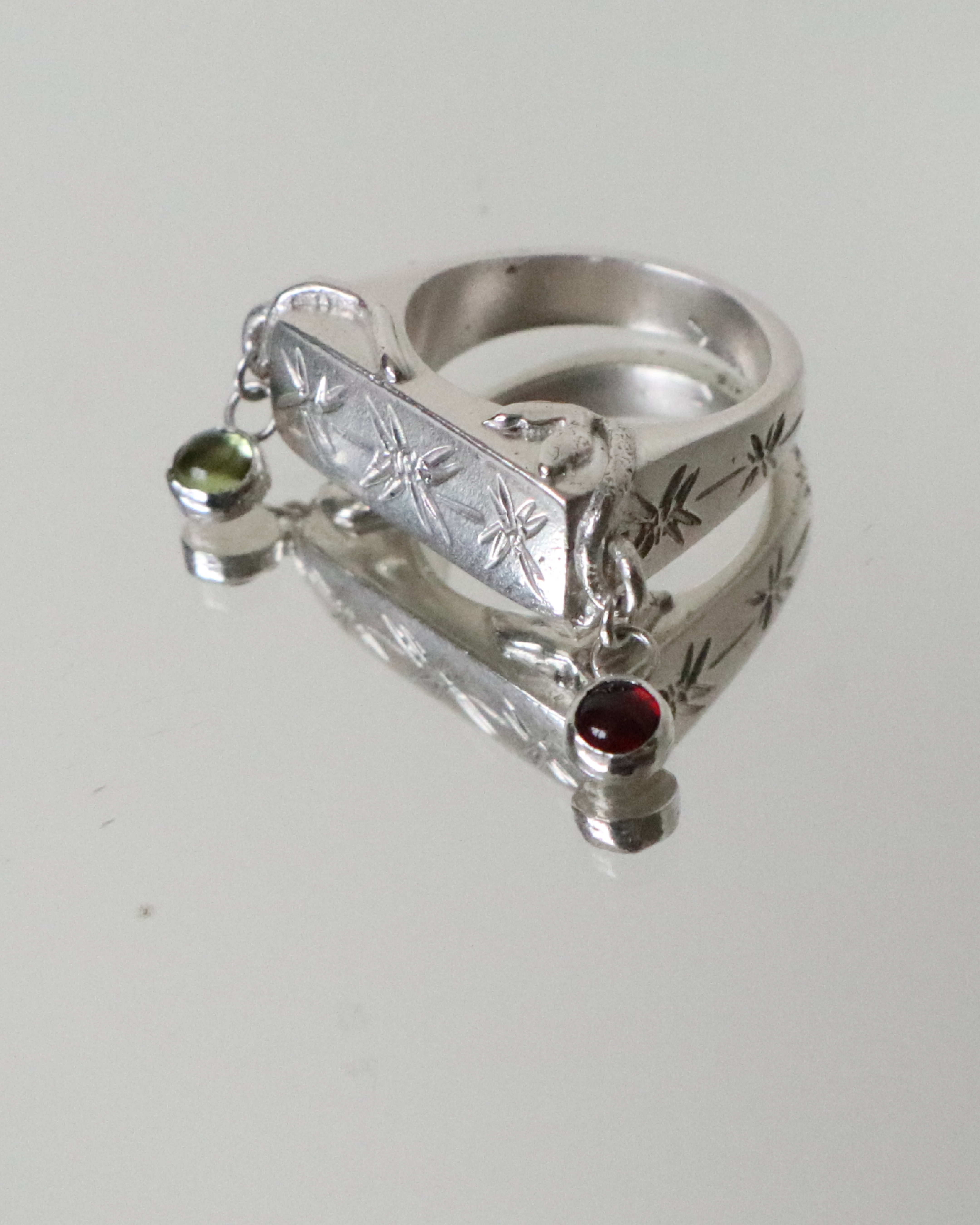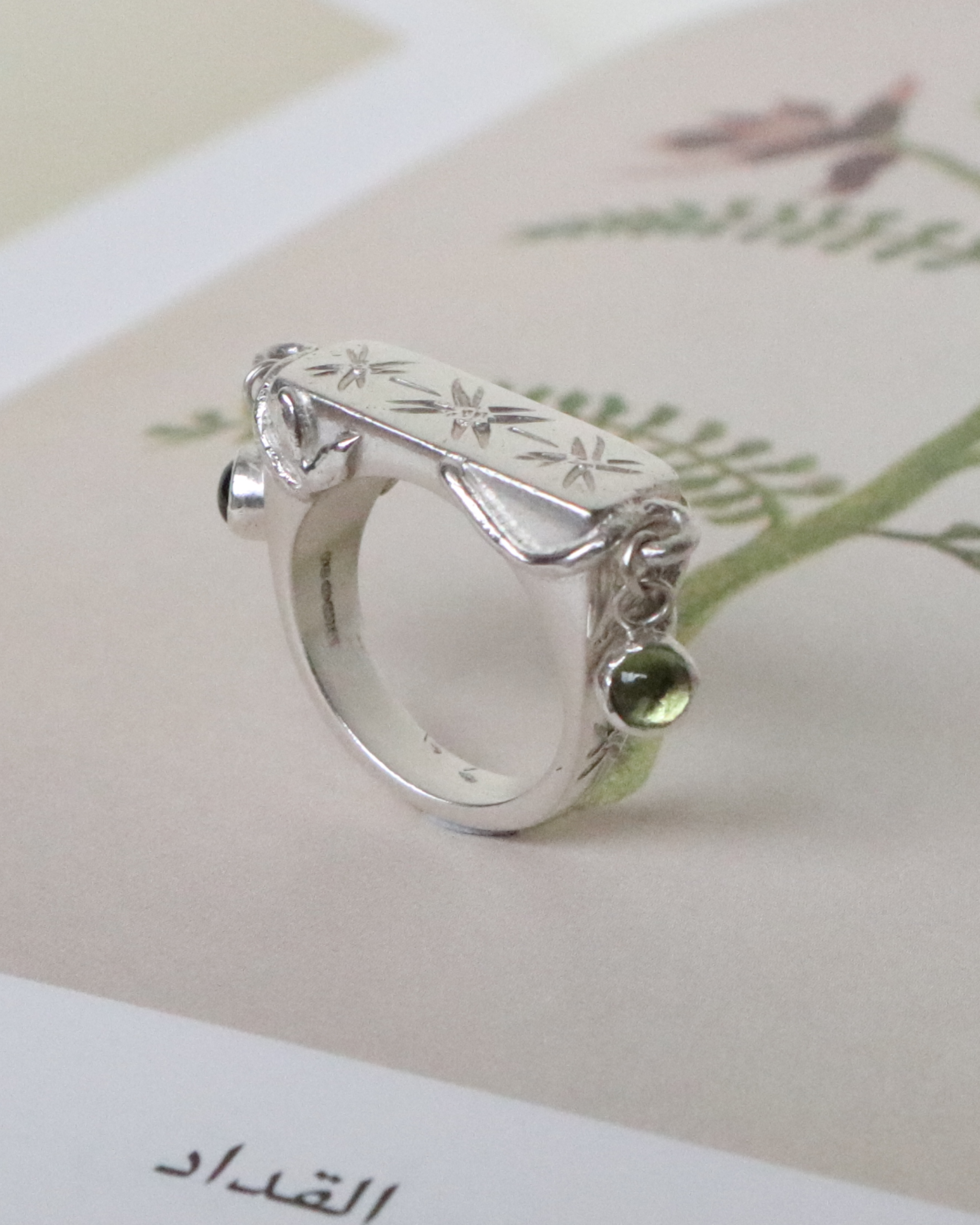 A collection of four rings inspired by Palestinian tatreez embroidery motifs, olive branches and friendship.