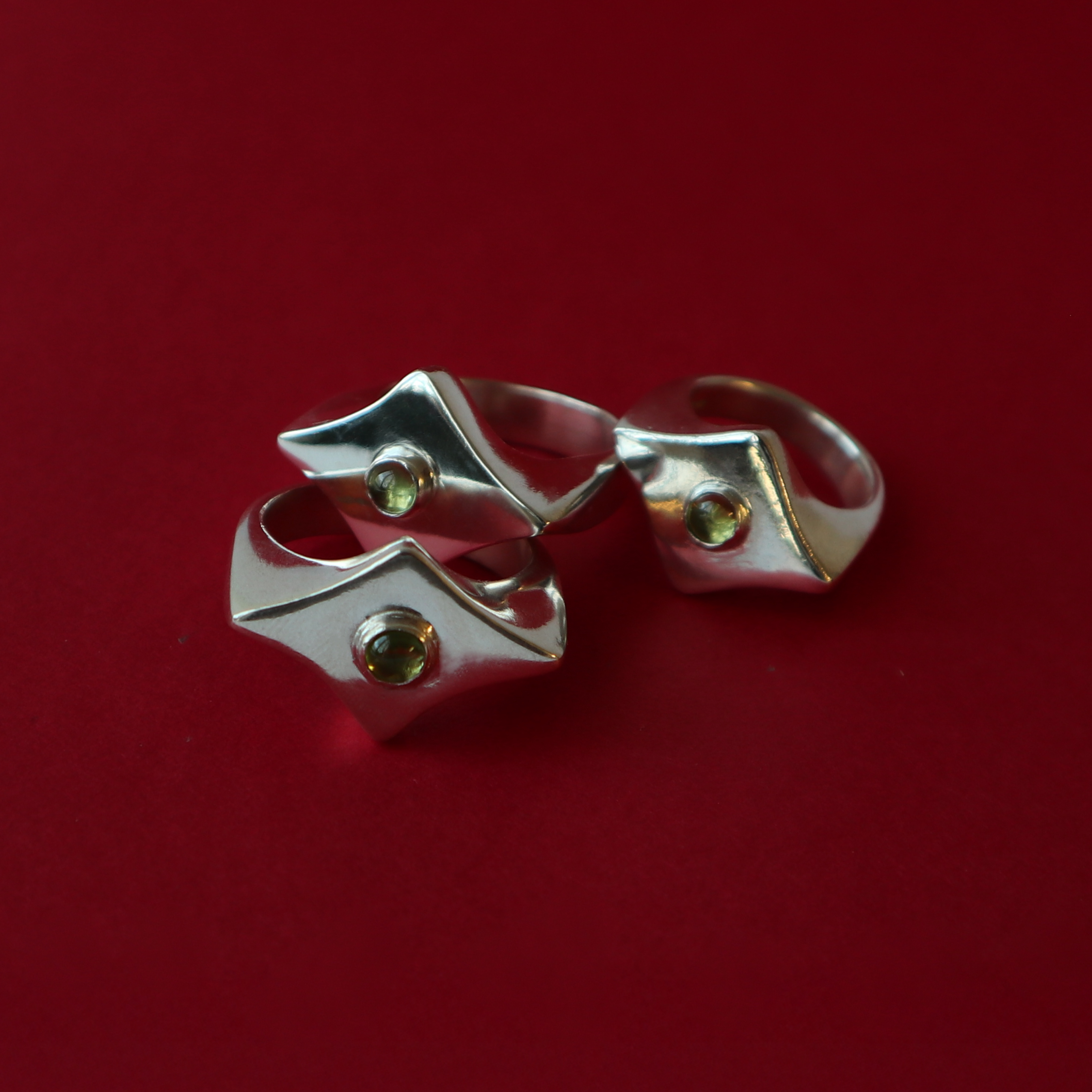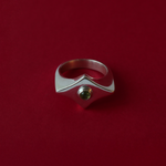 A diamond shaped ring with a small green peridot in the centre. The silhouette of this ring is loosely based on 15th and 16th century flanged maces in The Met Museum and the V&A.