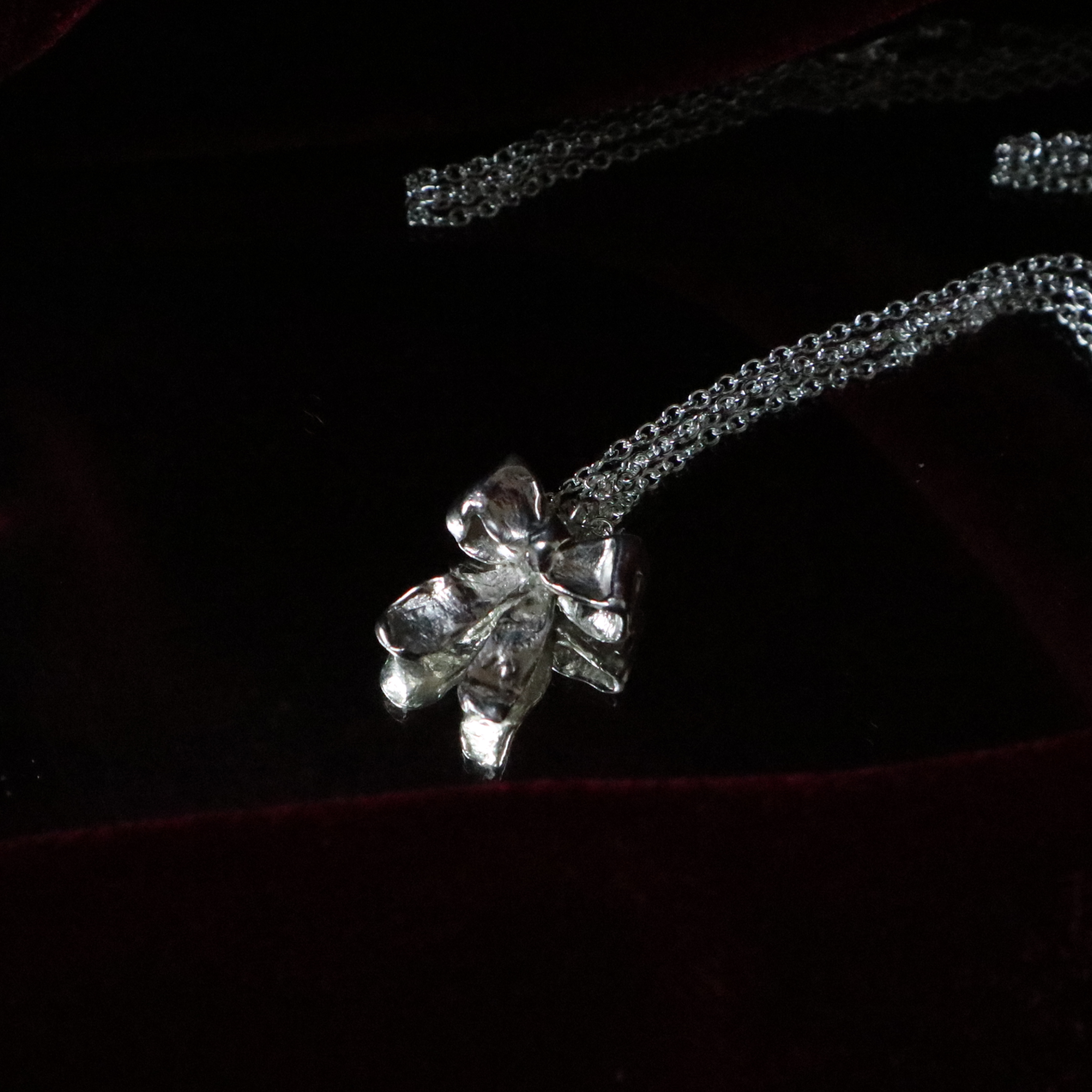 One of a kind bow pendants. Hand-sculpted and carved in wax and cast in metal using the lost-wax casting process.