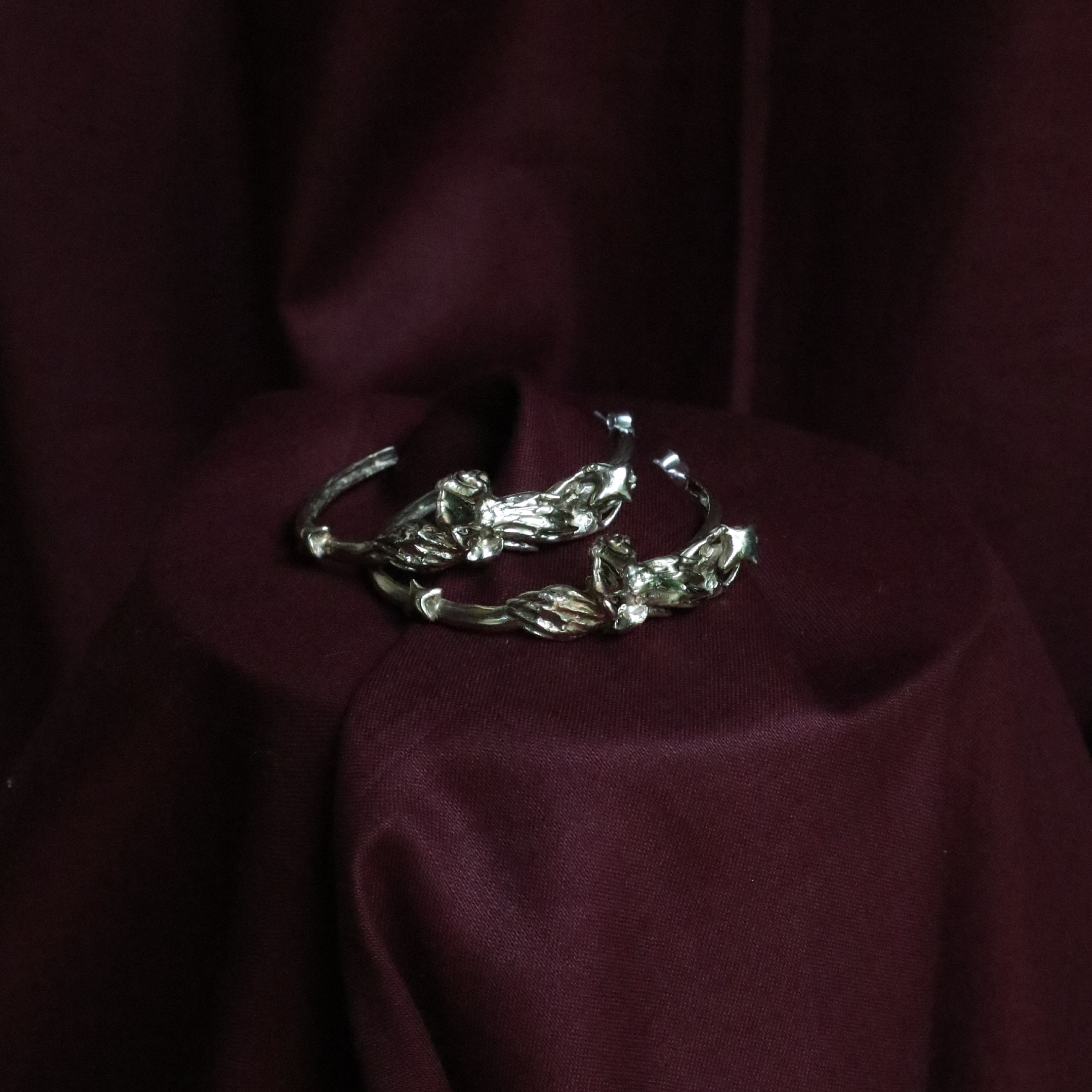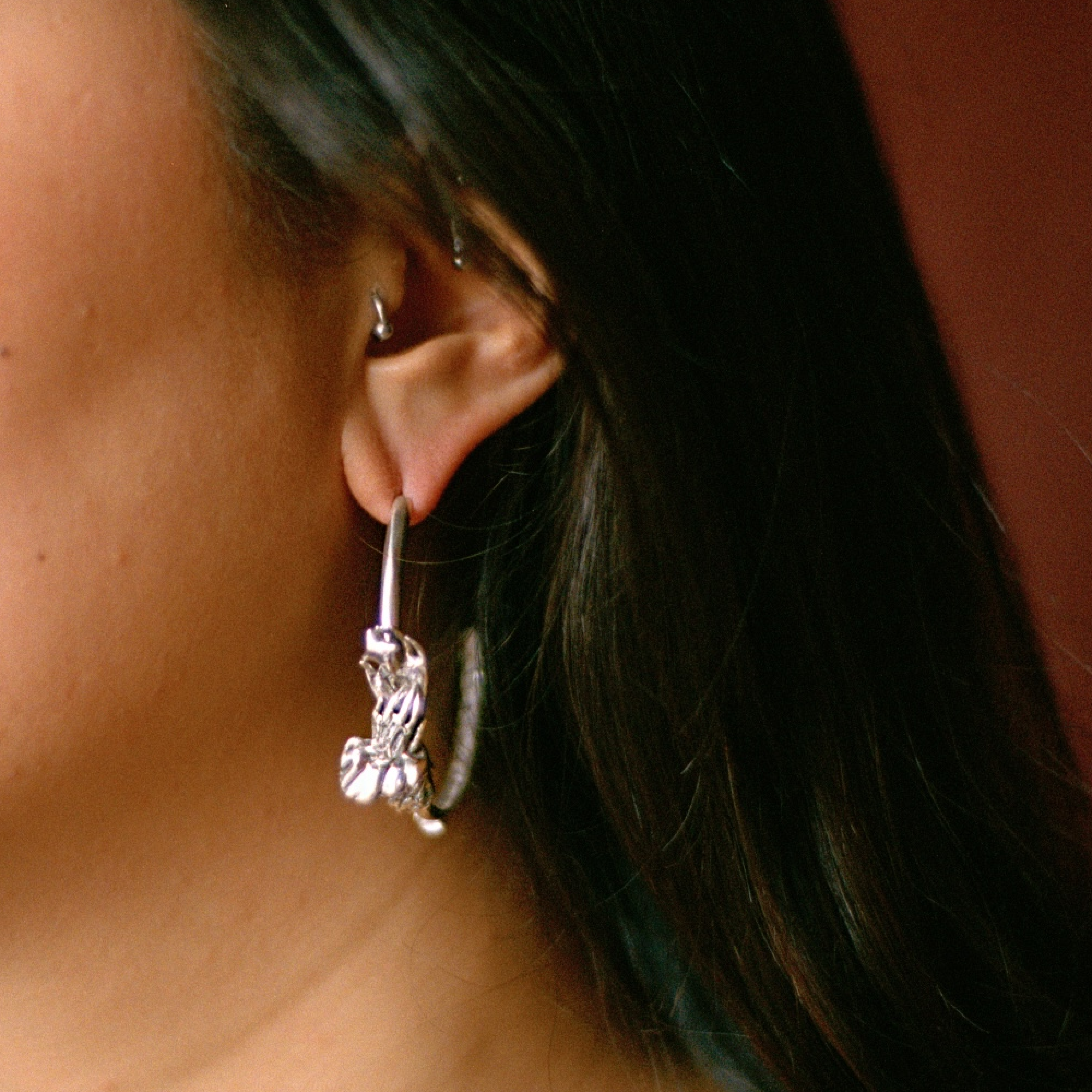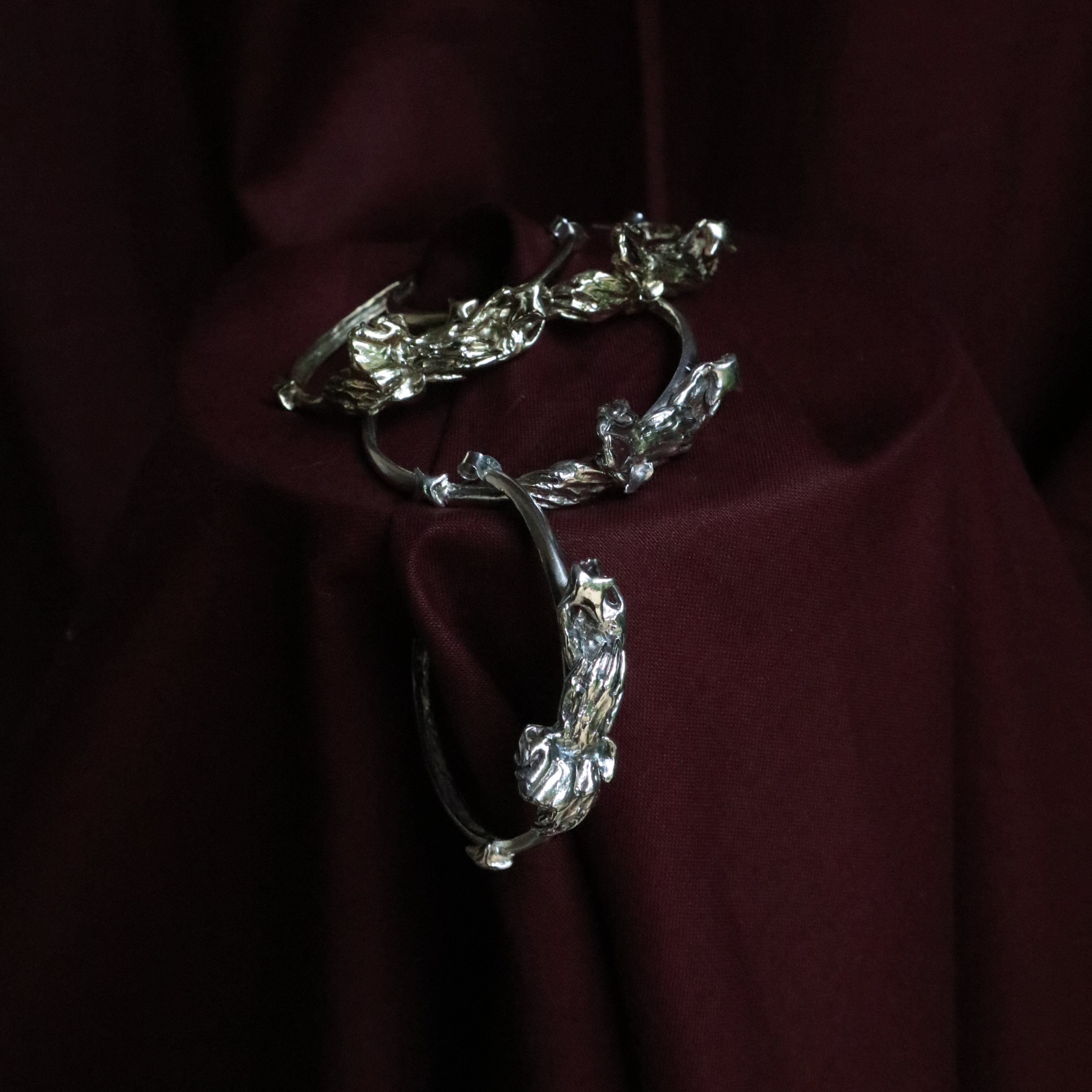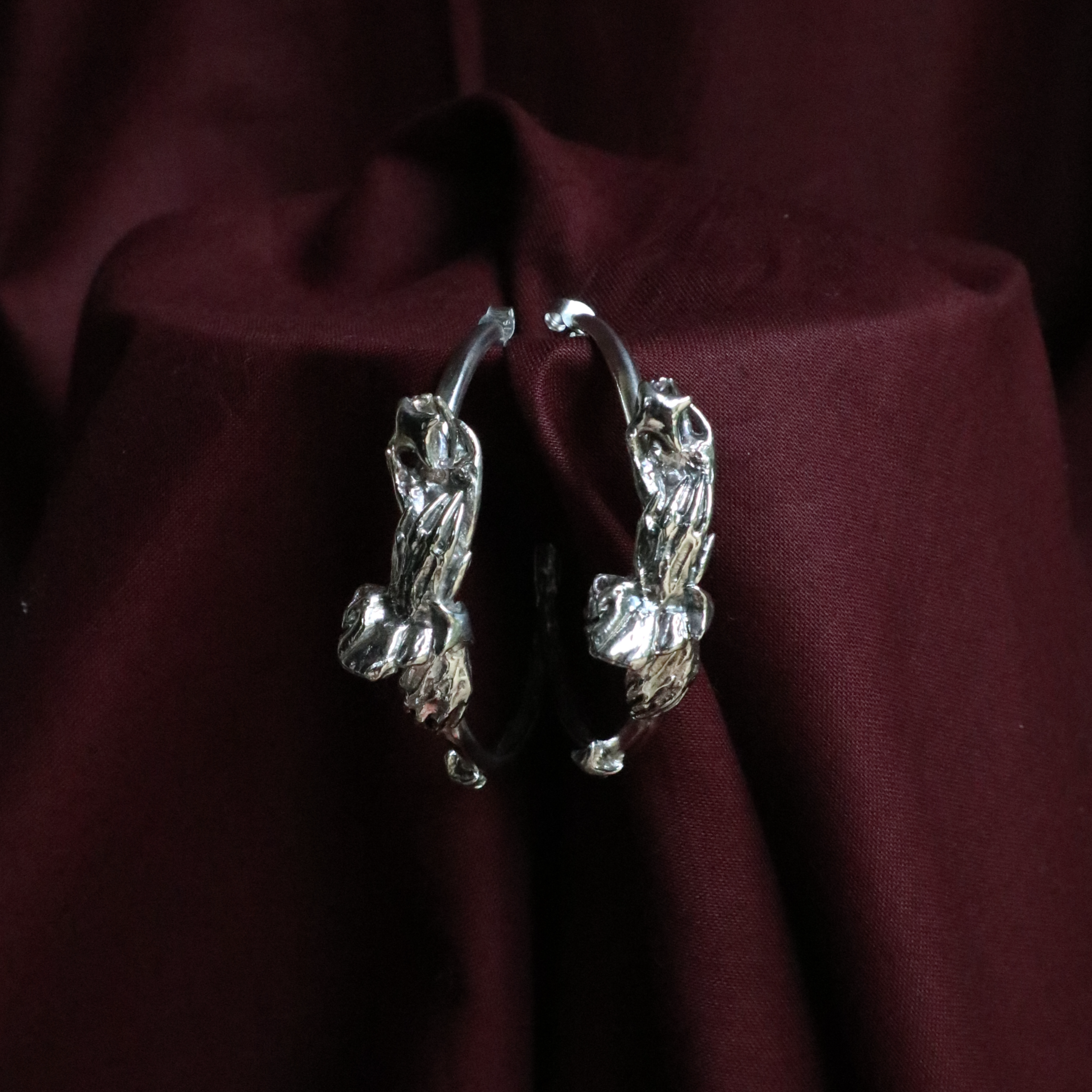 A pair of hoops decorated with three hands reaching towards star-like, diamond-shaped mace heads. Hand-sculpted and carved in wax and cast in metal using the lost-wax casting process.