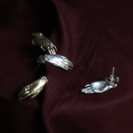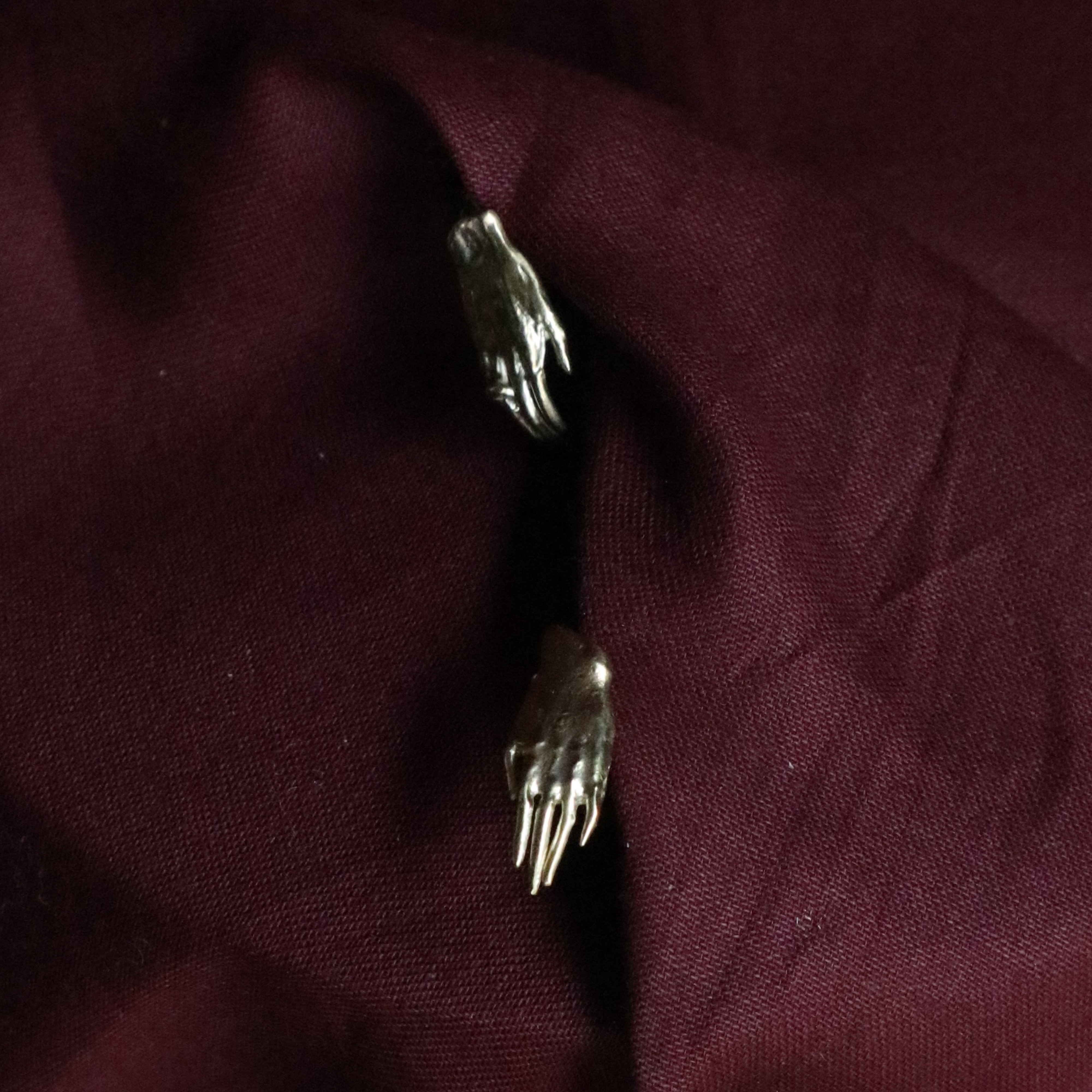 A pair of studs in the shape of hands, the right hand wears a small ring. Hand-sculpted in wax and cast in metal using the lost-wax casting process.