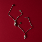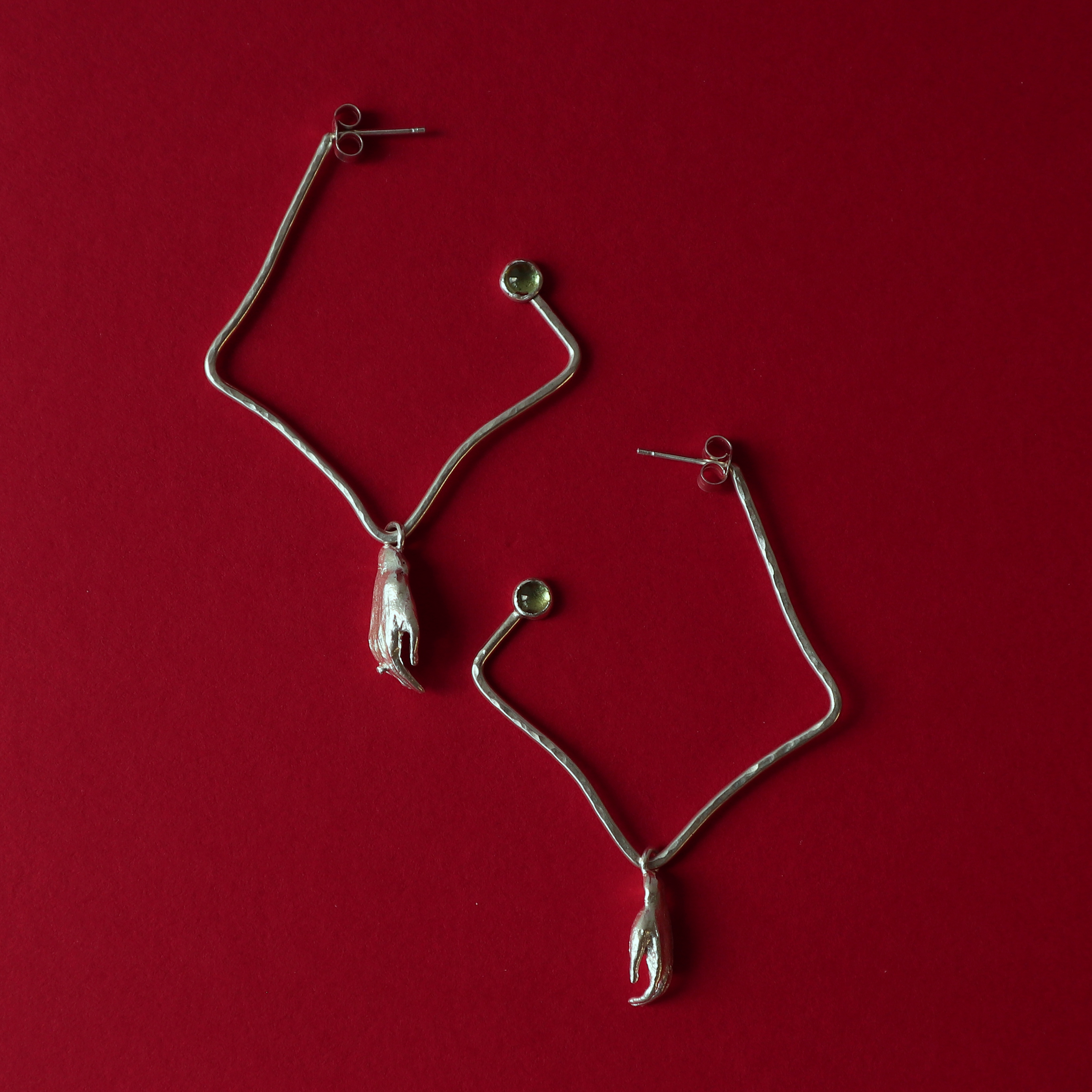 A pair of hammered diamond-shaped hoops each decorated with a lost-wax cast hand. The hoops are tipped with small green peridots.