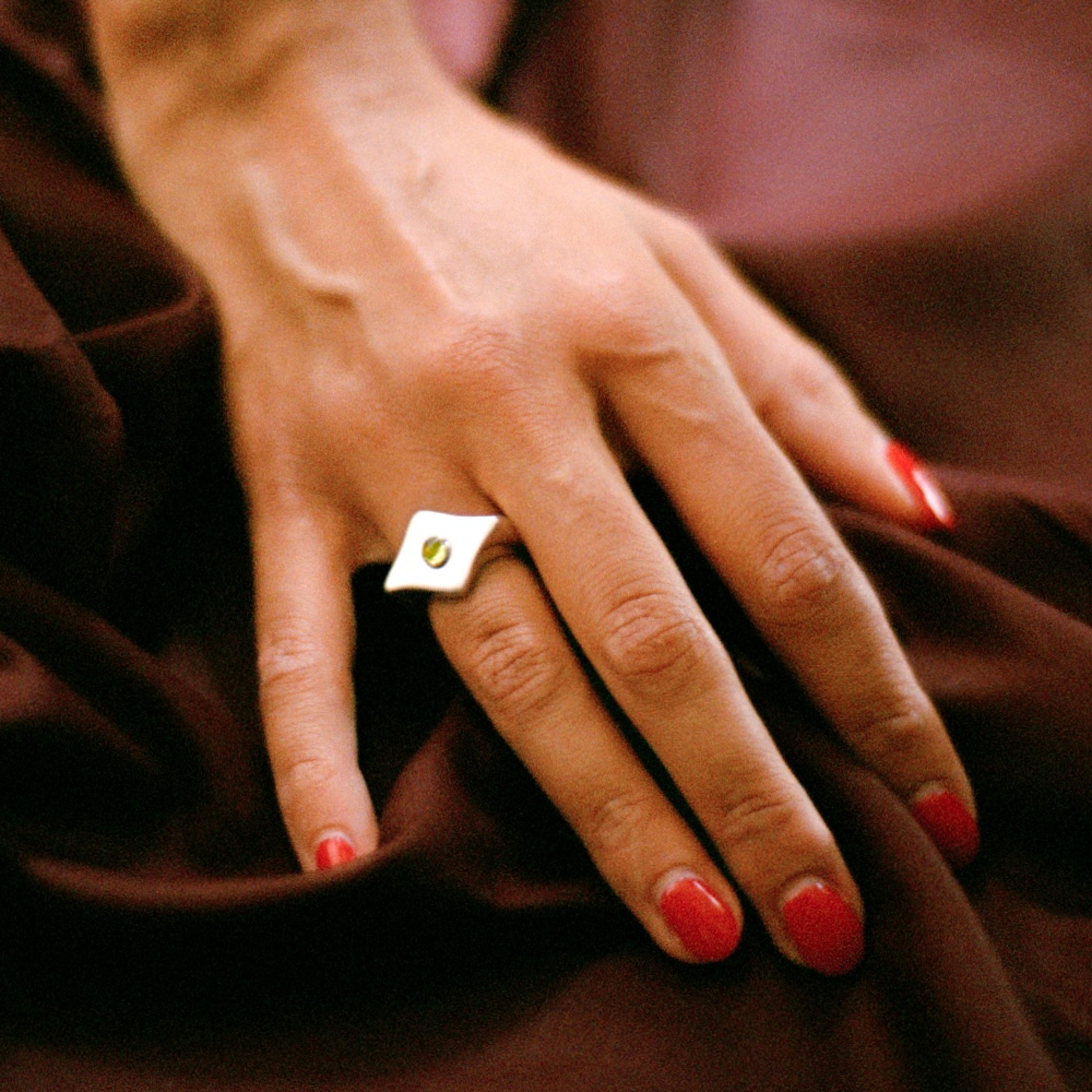A diamond shaped ring with a small green peridot in the centre. The silhouette of this ring is loosely based on 15th and 16th century flanged maces in The Met Museum and the V&A.