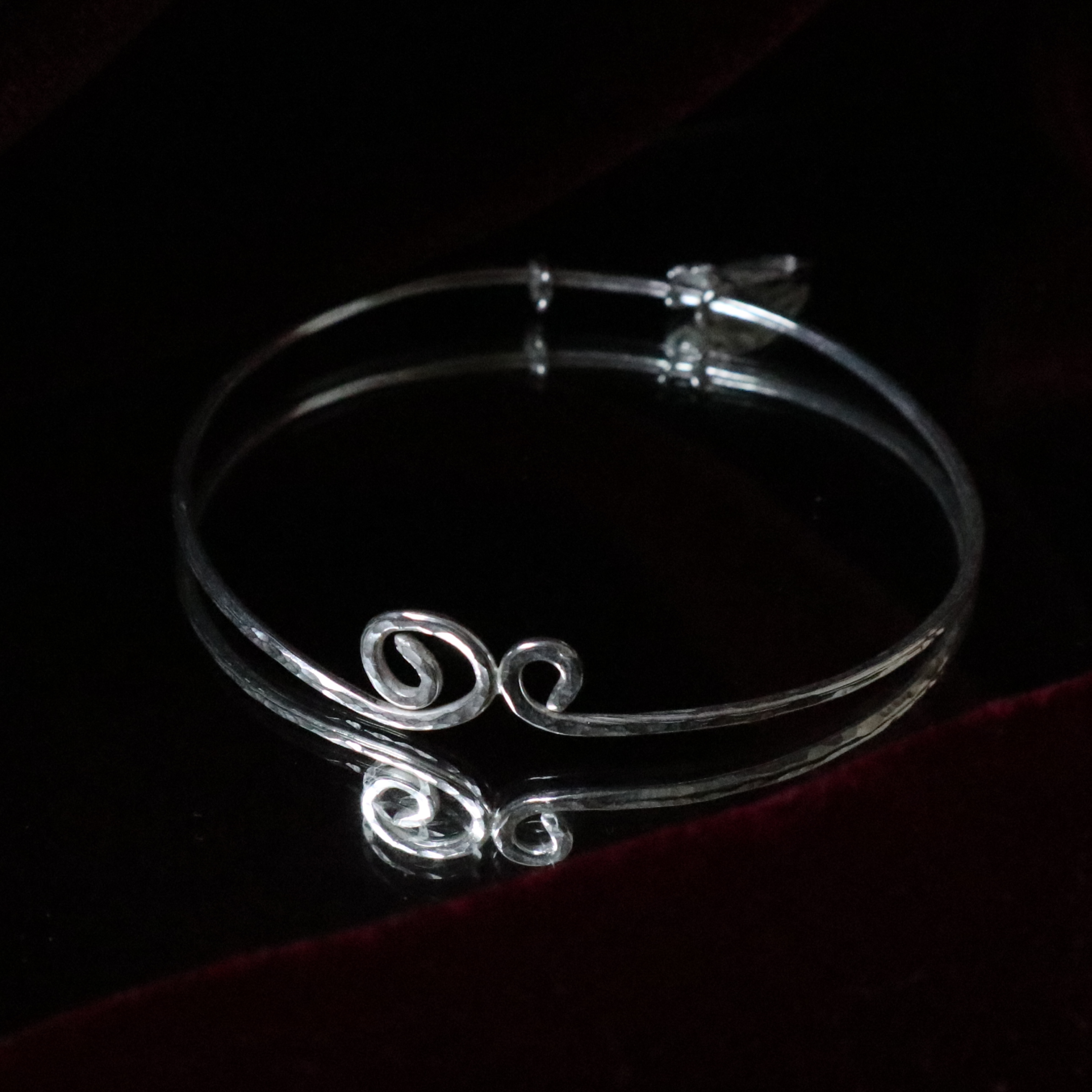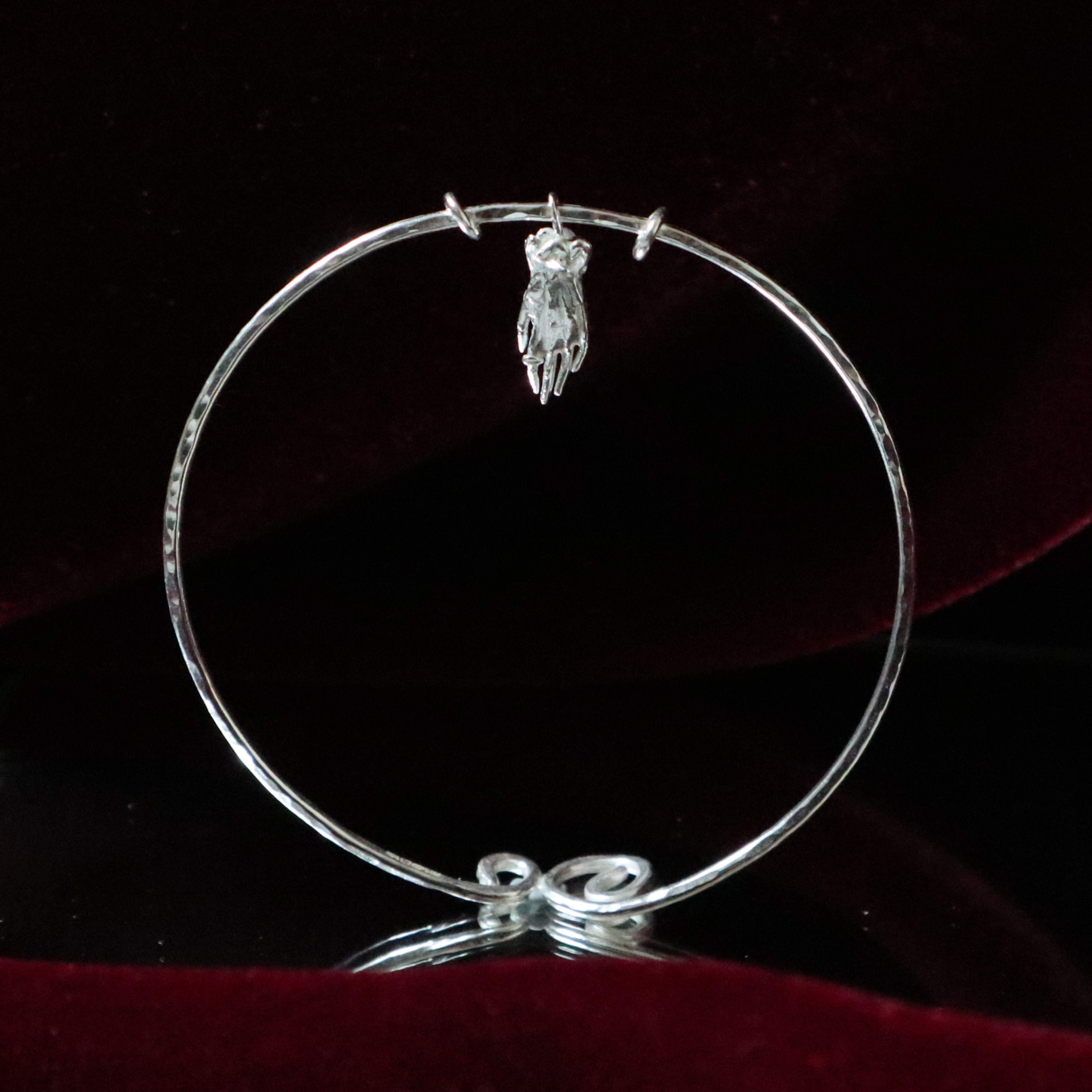 A one of a kind bangle based on a 17th century reja de ventana (window grille) from Chile. Adorned with a miniature ruffled glove wearing a little ring.READY TO SHIP IN SILVER